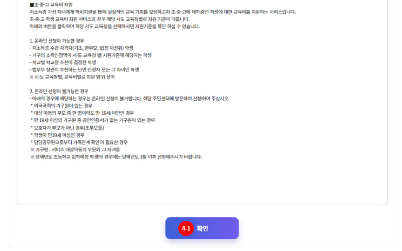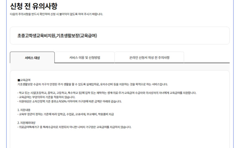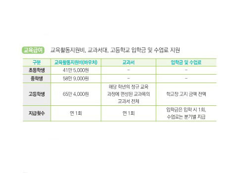 초, 중, 고등학교에 재학 중인 자녀가 있는 교육급여 대상 가구에게는 바우처 형태로 연 1회 교육급여를 지급합니다. 지급금액은 초등학생 415,000원, 중학생 589,000원, 고등학생 654,000원입니다.