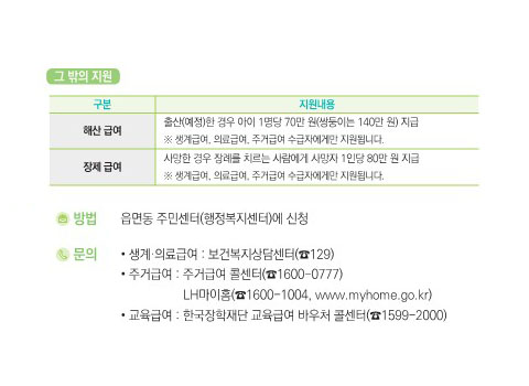생계, 의료, 주거급여 수급자가 사망하거나 태어난 경우 장제급여는 가구당 80만 원을 지급하고, 해산급여는 출산한 태아마다 70만 원씩을 지급합니다. 해산급여의 경우 출산예정일의 4주 전부터 신청이 가능합니다.