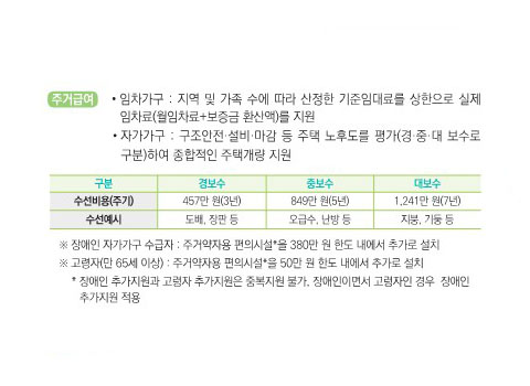 주거급여는 거주하는 방식이 임차인지 자가인지에 따라 지원하는 방식에 차이가 있습니다.