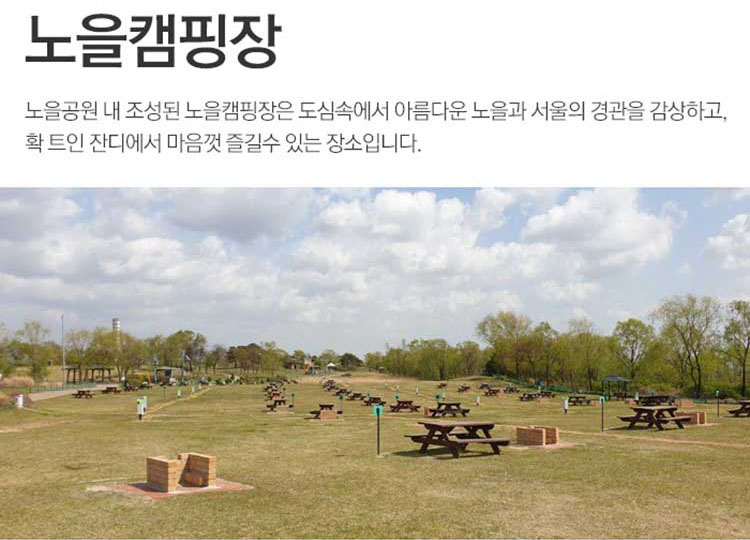 서울시에서 운영하는 9개의 캠핑장 중 노을캠핑장은 난지캠핑장과 더불어 가장 인기 있는 장소입니다. 예약제로 운영하는 노을 캠핑장의 주말 이용 예약은 시작하자마자 바로 매진될 정도로 예약하기도 쉽지 않습니다. 노을 캠핑장의 이용안내와 예약방법 등을 정리해 놓았으니, 내용 참조하셔서 즐거운 캠핑 즐겨보셨으면 좋겠습니다.