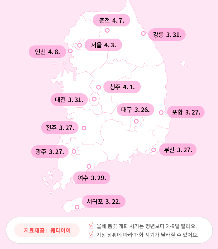 올해는 평년보다 따뜻한 기온으로 벚꽃 개화시기가 지역에 따라 평년보다 1일~7일 정도 빠르다고 합니다. 아래는 웨더아이에서 발표한 자료로 만개한 벚꽃을 즐기시려면 꼭 참조하시기 바랍니다.