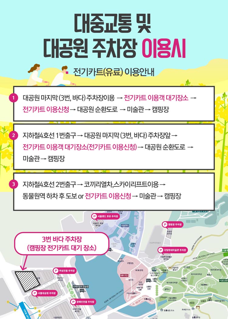 1) 지하철 : 지하철4호선 대공원역 2번 출구 → 서울랜드정문 → 현대미술관 → 서울대공원 캠핑장