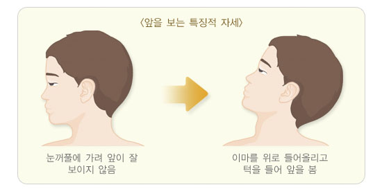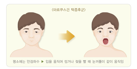 윗눈꺼풀을 위로 들어 올리기 위해 이마를 위로 치켜뜨거나 턱을 위로 들어 올리는 행동을 보이거나, 아래쪽을 쳐다볼 때 윗눈꺼풀이 따라서 내려가지 못하고 눈을 완전히 감지 못한다면 안검하수를 의심해 볼 수 있습니다. 또한 입을 움직여 음식을 씹거나 하품 등을 할 때 평소 처진 윗눈꺼풀이 위아래로 오르락내리락하는 모습을 보인다면 안검하수의 증상인 마르쿠스건 턱증후군 도 의심해 보아야 합니다.
