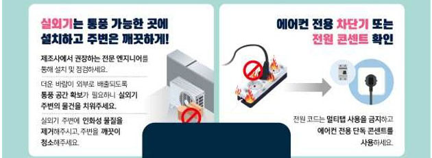 한국소비자원이 주요 에어컨 제조사인 삼성, LG, 캐리어, 위니아와 함께 '에어컨 안전점검 캠페인'을 실시합니다. 2020년부터 2022년까지 최근 3년간 에어컨 관련 화재건수는 749건에 달할 만큼 에어컨은 여름철 사용하는 기기 중 화재사고가 가장 많은 제품으로 알려져 있습니다. 이를 대비하기 위해서는 사용환경의 점검과 누전차단기와 같은 안전부품의 꾸준한 관리가 필요합니다.