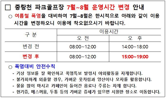 중랑천이 지나는 동대문구, 광진구, 노원구에서는 각각 중랑천 파크골프장을 운영하고 있습니다. 지역주민은 물론 다른 지역주민 모두 편리하게 이용할 수 있습니다. 중랑천 파크골프장의 이용 및 예약방법은 구청마다 차이가 있으니 확인해 보시고, 즐거운 파크골프 라운딩 되시기 바랍니다.