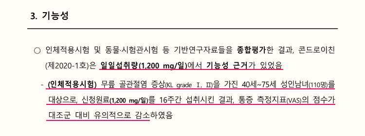 다만 식약처에서 발행하는 콘드로이친과 관련한 내용을 가진 '건강기능식품 기능성원료 소비자 리포트'에서는 콘드로이친의 일일섭취량 1,200 mg 은 안전한 수준이라고 언급하고 있으며, 무릎 골관절염 증상을 가진 40~75세 성인남녀에게 16주간 섭취시킨 결과 통증 측정지표가 대조군 대비 유의적인 감소가 있었다고 하는 내용이 있습니다. 이것으로 보아 어떤 제조사에서 식약처 검증을 의뢰하기 위한 인체적용시험을 실시하는 과정에서 콘드로이친의 효과를 보기 위해 적용한 하루 섭취량 정도로 이해하면 될 것 같습니다.
